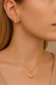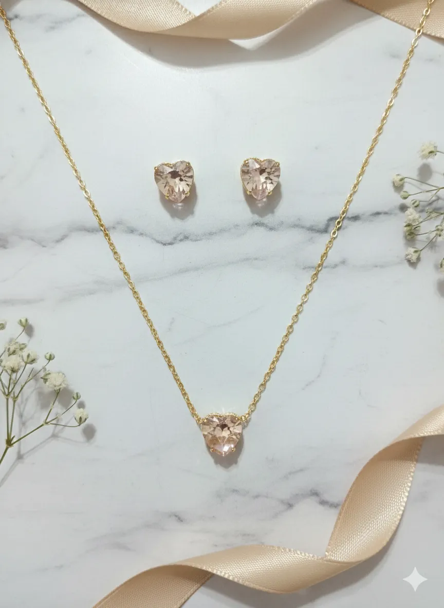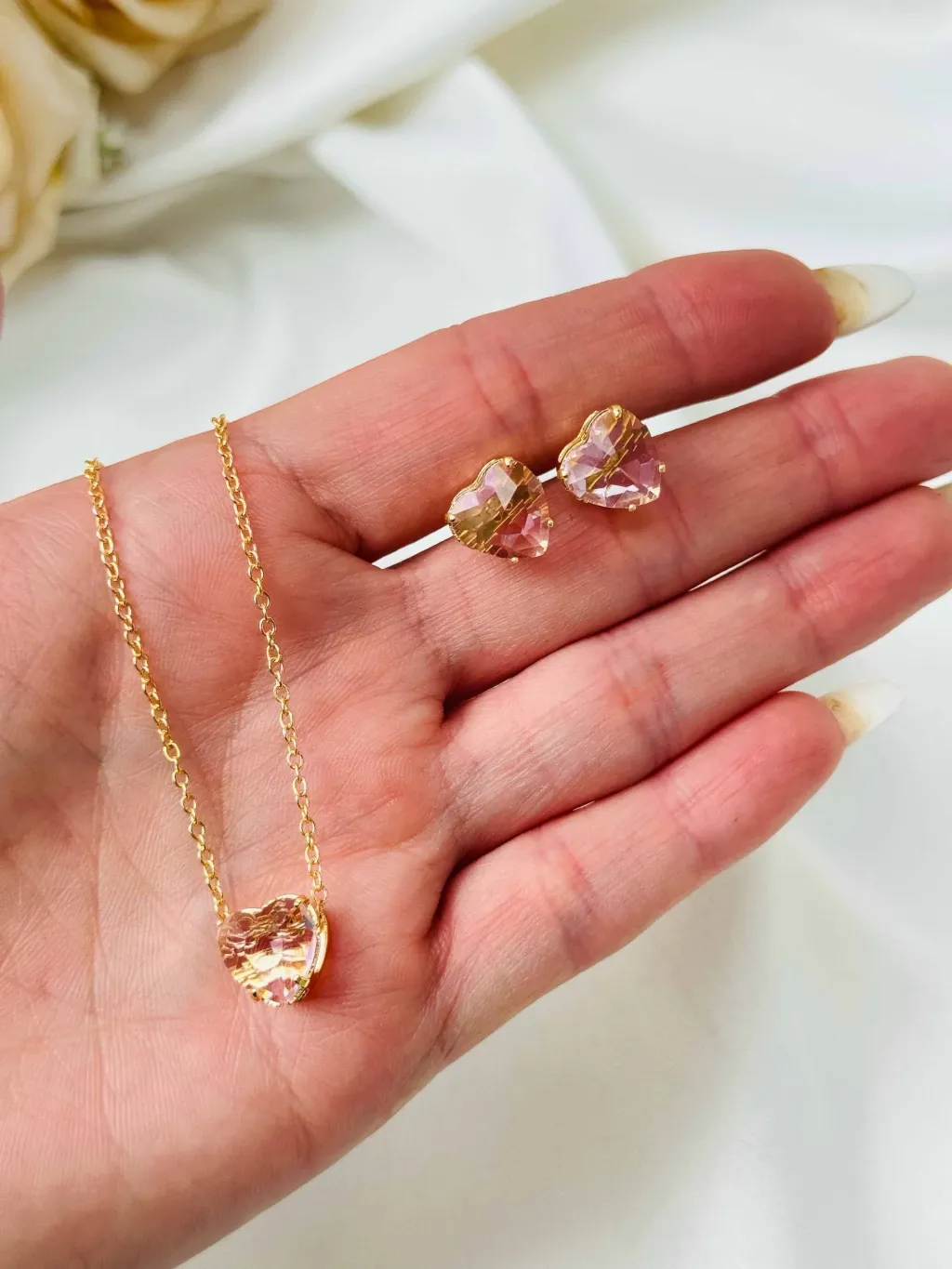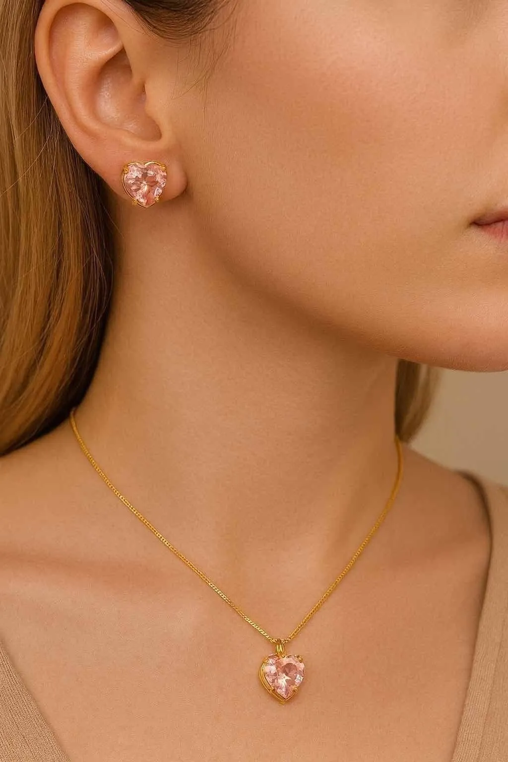 Kit Colar e Brinco Coração Zircônia Rosa Folheado 18k