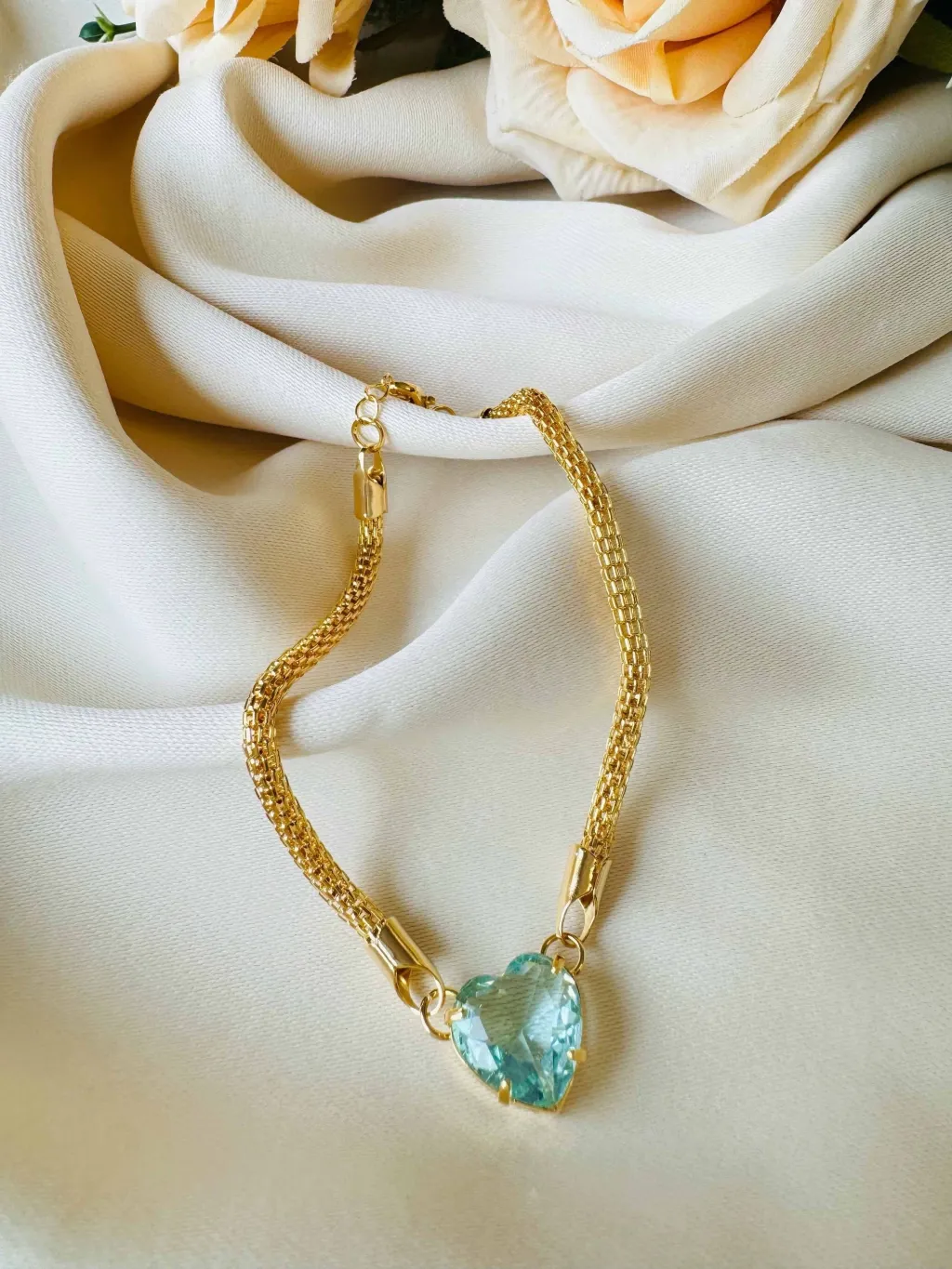 A pulseira da imagem é uma peça elegante e romântica, perfeita para quem valoriza acessórios delicados com brilho e acabamento refinado. Seu design combina uma corrente trabalhada com um lindo pingente em formato de coração, adornado por uma pedra em tom azul claro, que transmite feminilidade, charme e sofisticação.