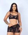 Conjunto sensual com saia em tule. A saia possui abertura traseira, com elástico transpassado.
