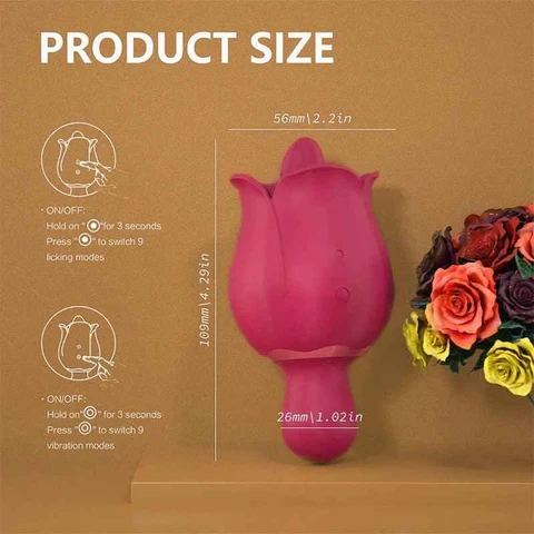 A Rosa estimulador de clitóris 2x1 possui o formato discreto e fofinho de rosa que vai te surpreender pois ele atua por língua estimuladora e bolinha vibratória que promove uma massagem diretamente no clitóris te fazendo ter orgasmos de forma rápida. De um lado possui uma língua que vibra e faz movimentos, do outro possui uma bolinha vibratória que pode ser usada para estimular o clitóris, fazer penetração, estimular os seios ou qualquer outra parte do corpo.