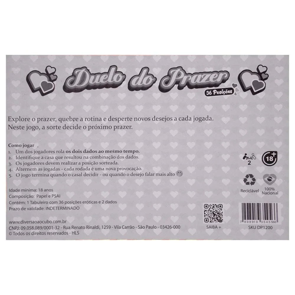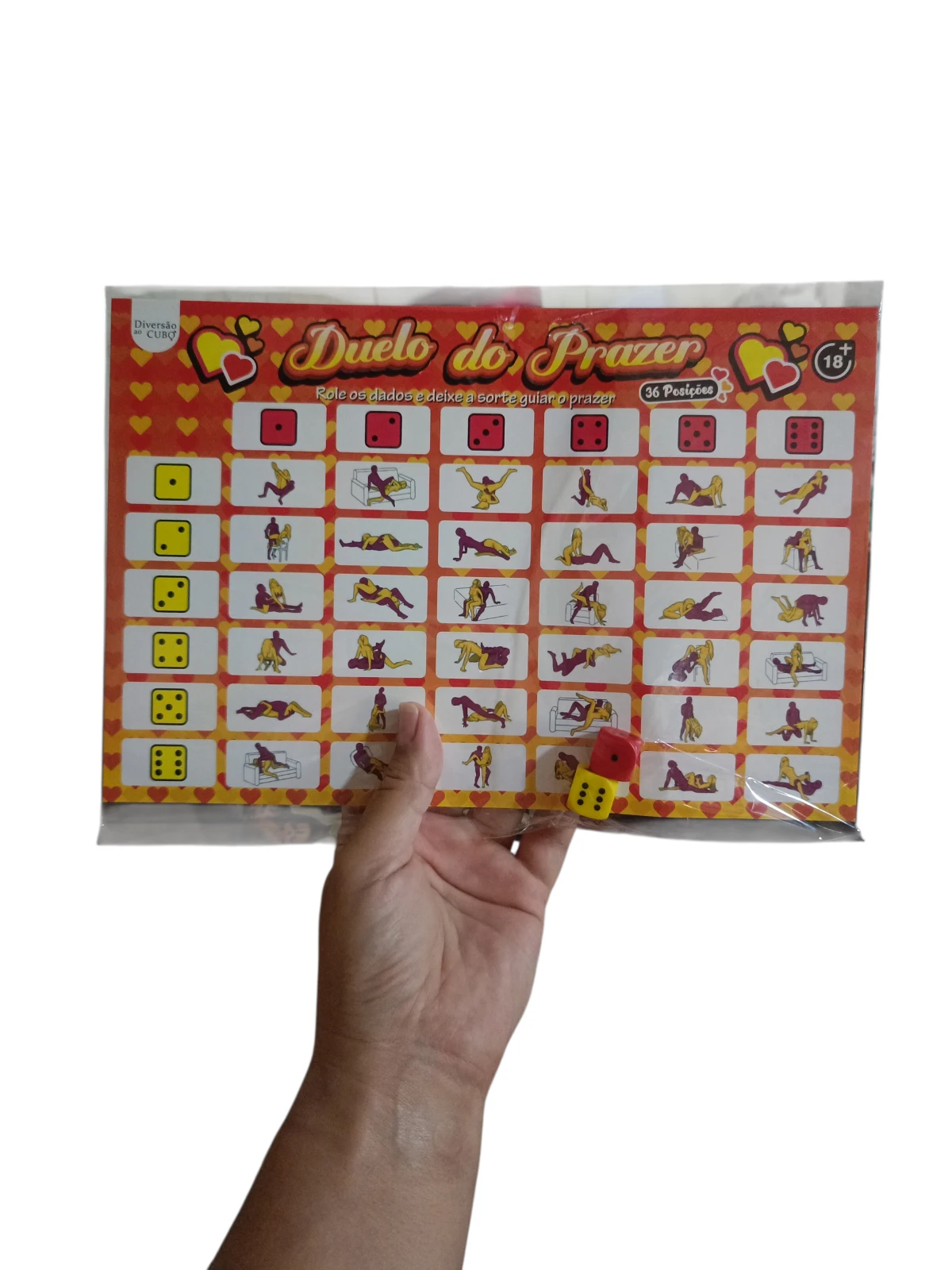 Jogo erótico Duo do Prazer com 36 posições para vocês explorarem juntos. A cada rodada, os dados sugerem posições e desafios, quebrando a rotina e acendendo a chama da intimidade. Ideal para casais que desejam experimentar novas sensações de forma lúdica e segura. Conteúdo: 1 tabuleiro com 36 posições eróticas e 2 dados. Recomendado para maiores de 18 anos. Compacto e fácil de levar para o quarto, hotel ou viagem.