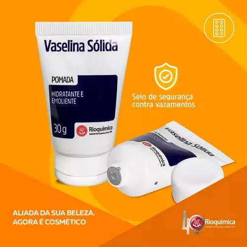 Vaselina Sólida Pomada produto formulado a partir da mistura de óleos hidrogenados atóxicos e das parafinas macro e micro cristalinas, apresenta uma excelente maciez ao toque, é neutra e isenta de odor. Indicado como emoliente. No tratamento de rachaduras da pele, como umectante. Tem efeito emoliente e melhora a elasticidade. Apresentação: embalagem com 30g bisnaga