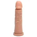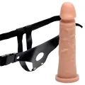 Cinto ajustável do P ao G com prótese de silicone medindo 17,5cm de comprimento por 3,5cm de diâmetro, cor bege.