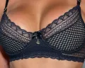 Conjunto de aro confeccionado em renda e renda arrastão, com colchete duplo, alça de regulagem de coração em metal dourado, busto sem forro. Calcinha regulável confeccionada em renda e renda arrastão com fundinho forrado em algodão.