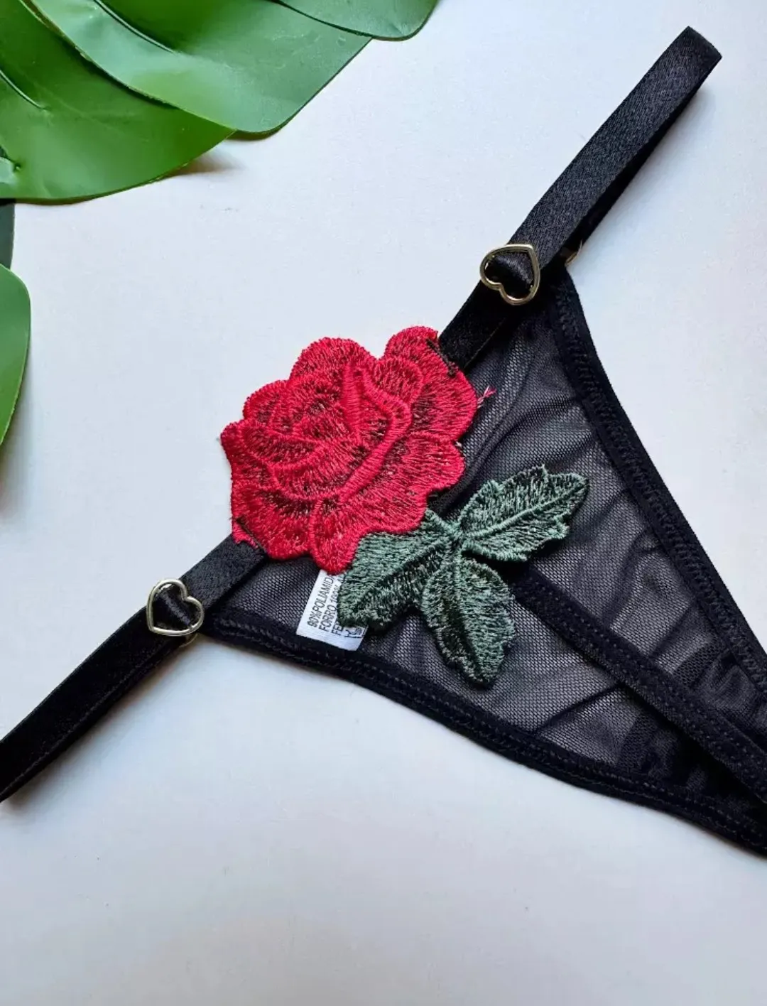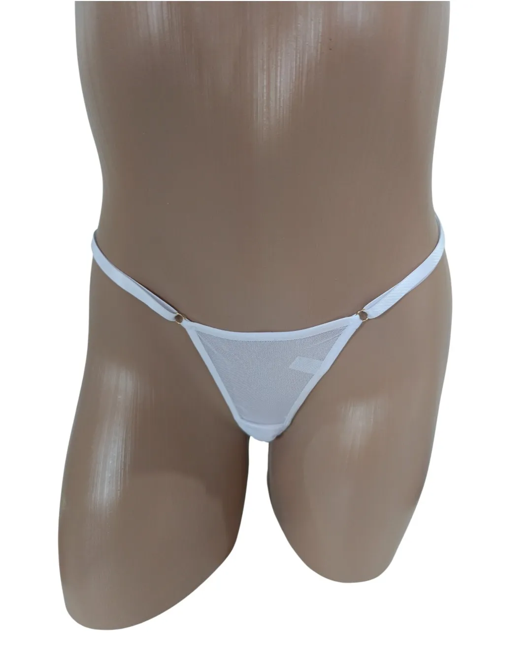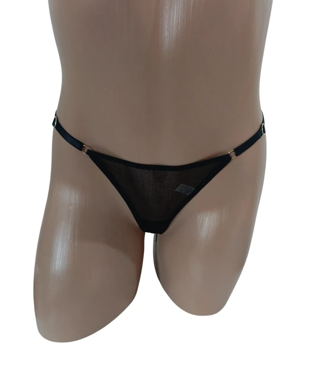 Tanga fio confeccionada em tule com regulagem em metal dourado, e fundinho forrado em algodão.