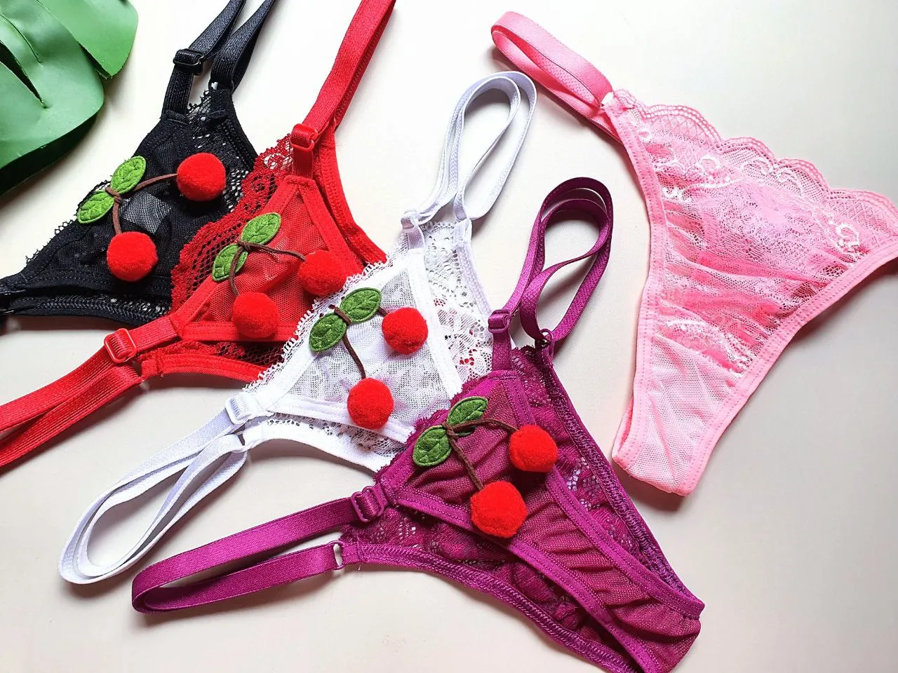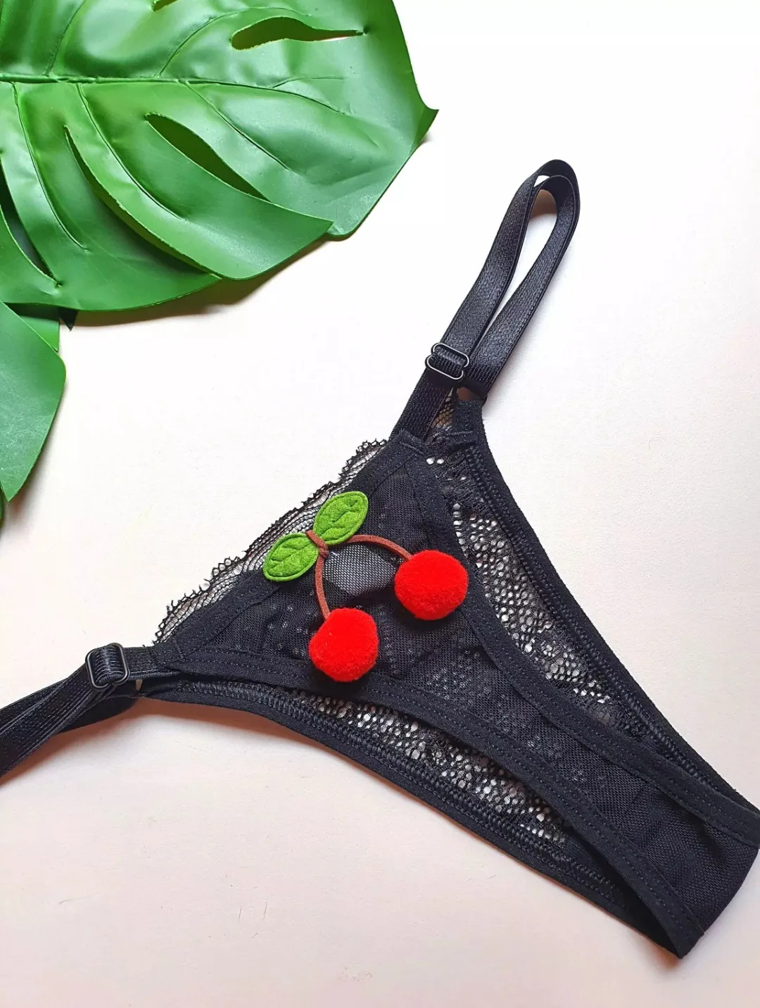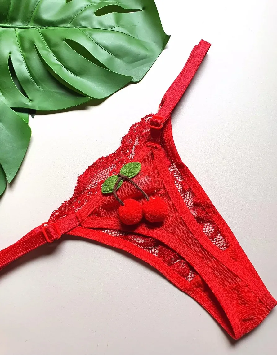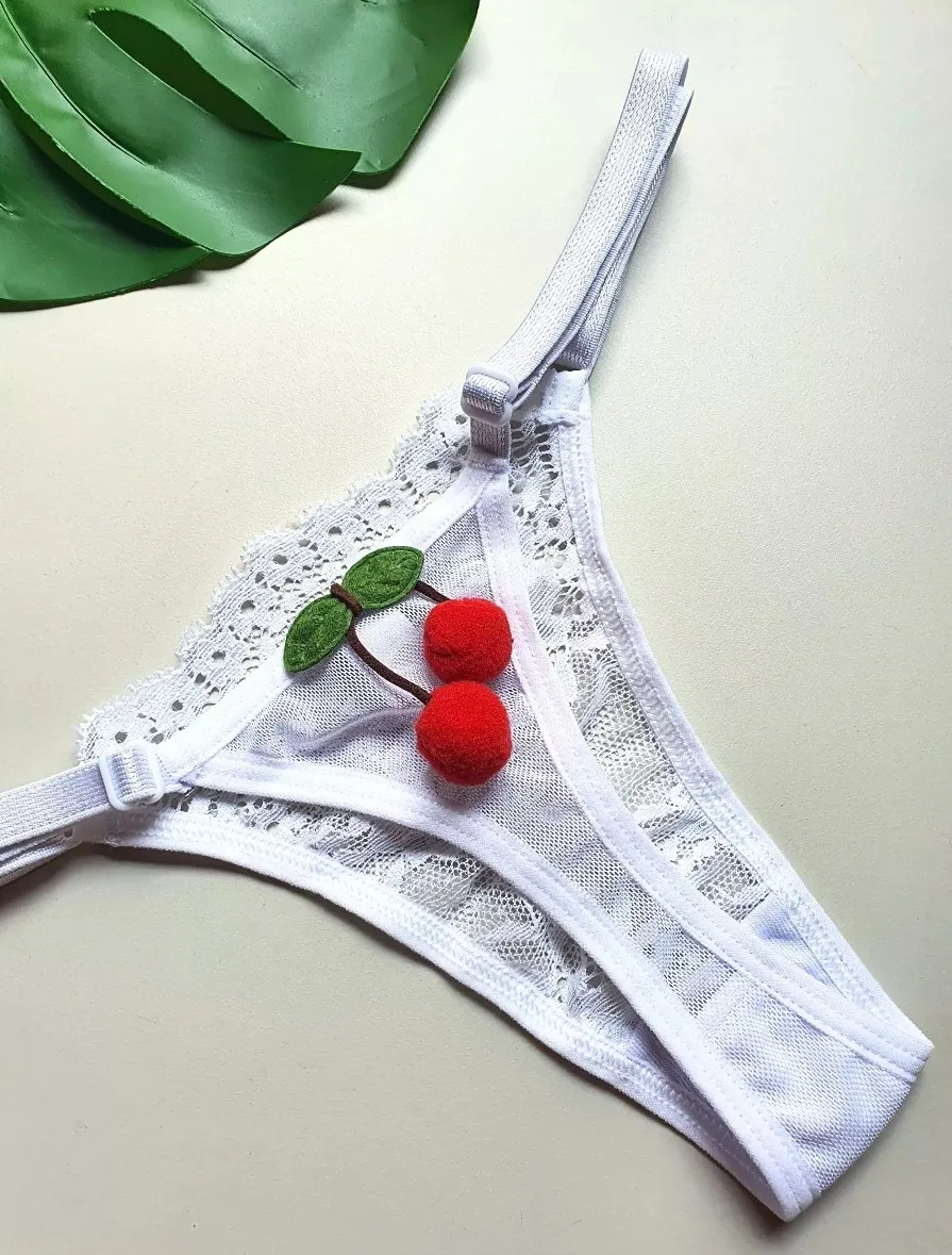 Tanga com regulagem de tamanho confeccionada em renda na frente e tulê atrás, fundo forrado em algodão, cereja em pelúcia pedurada.