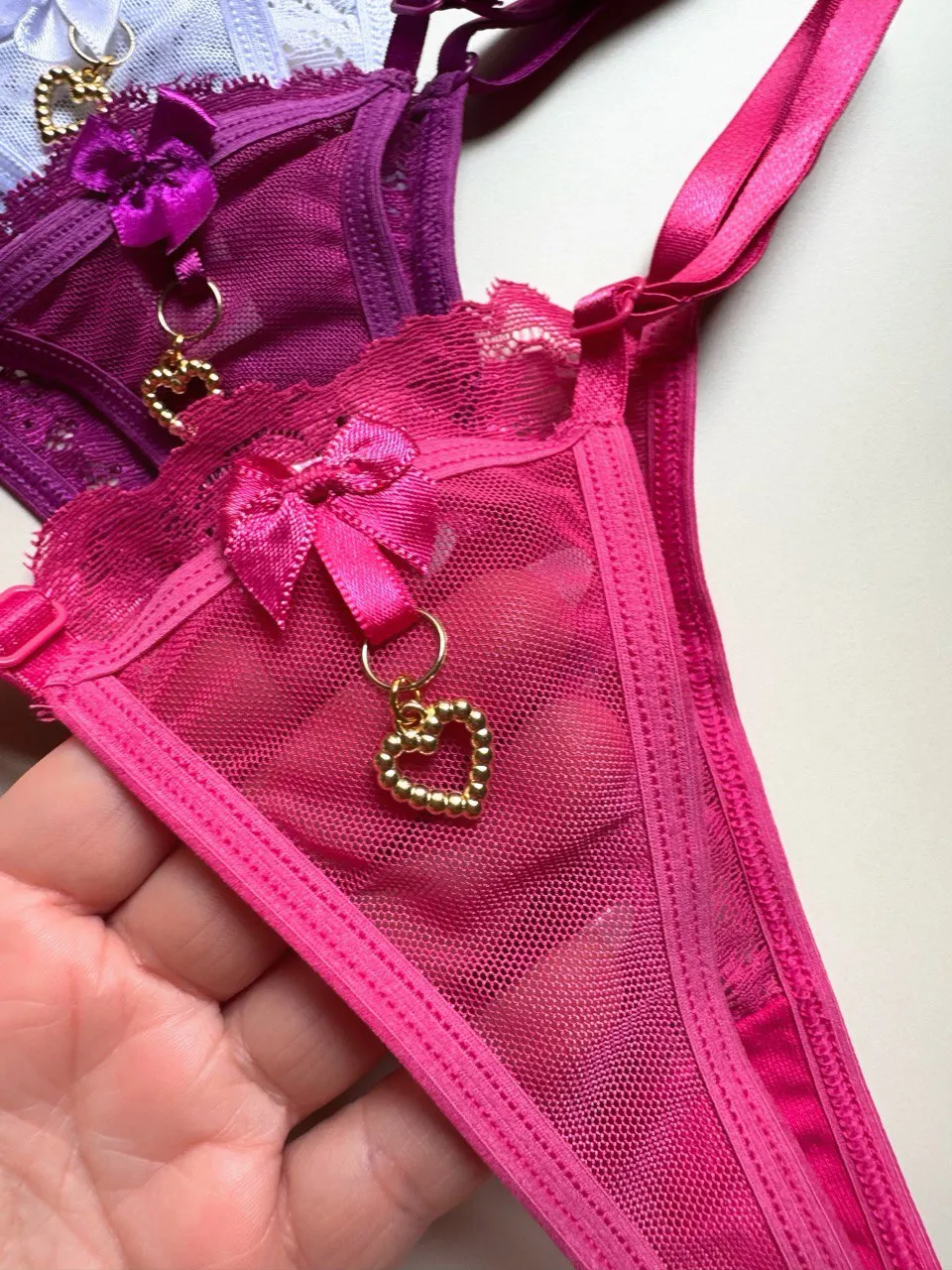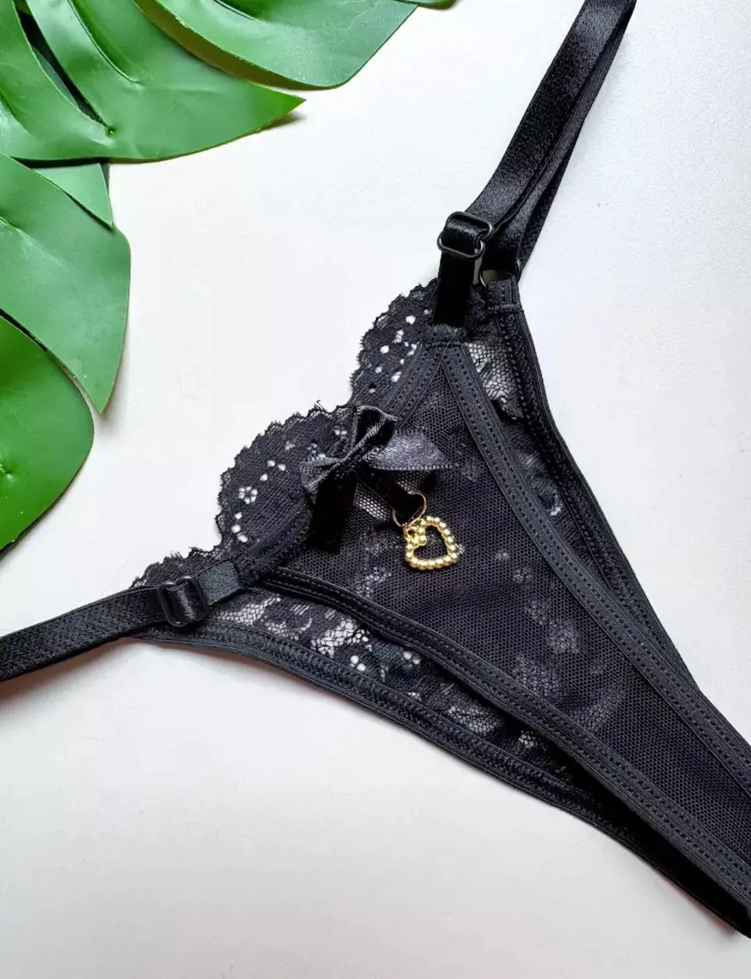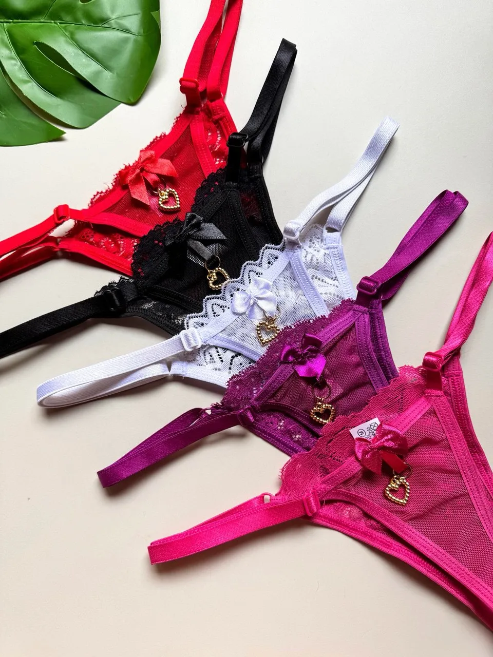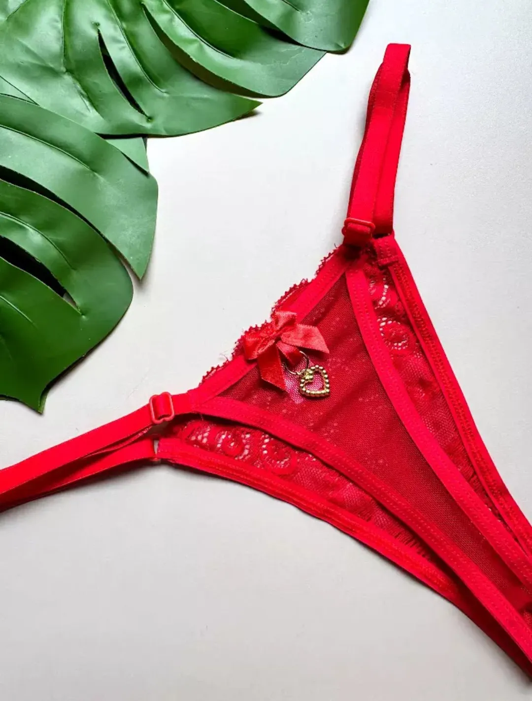 Tanga Confeccionada em tule e renda, com um pingente preso no lacinho atrás e fundinho forrado em algodão.