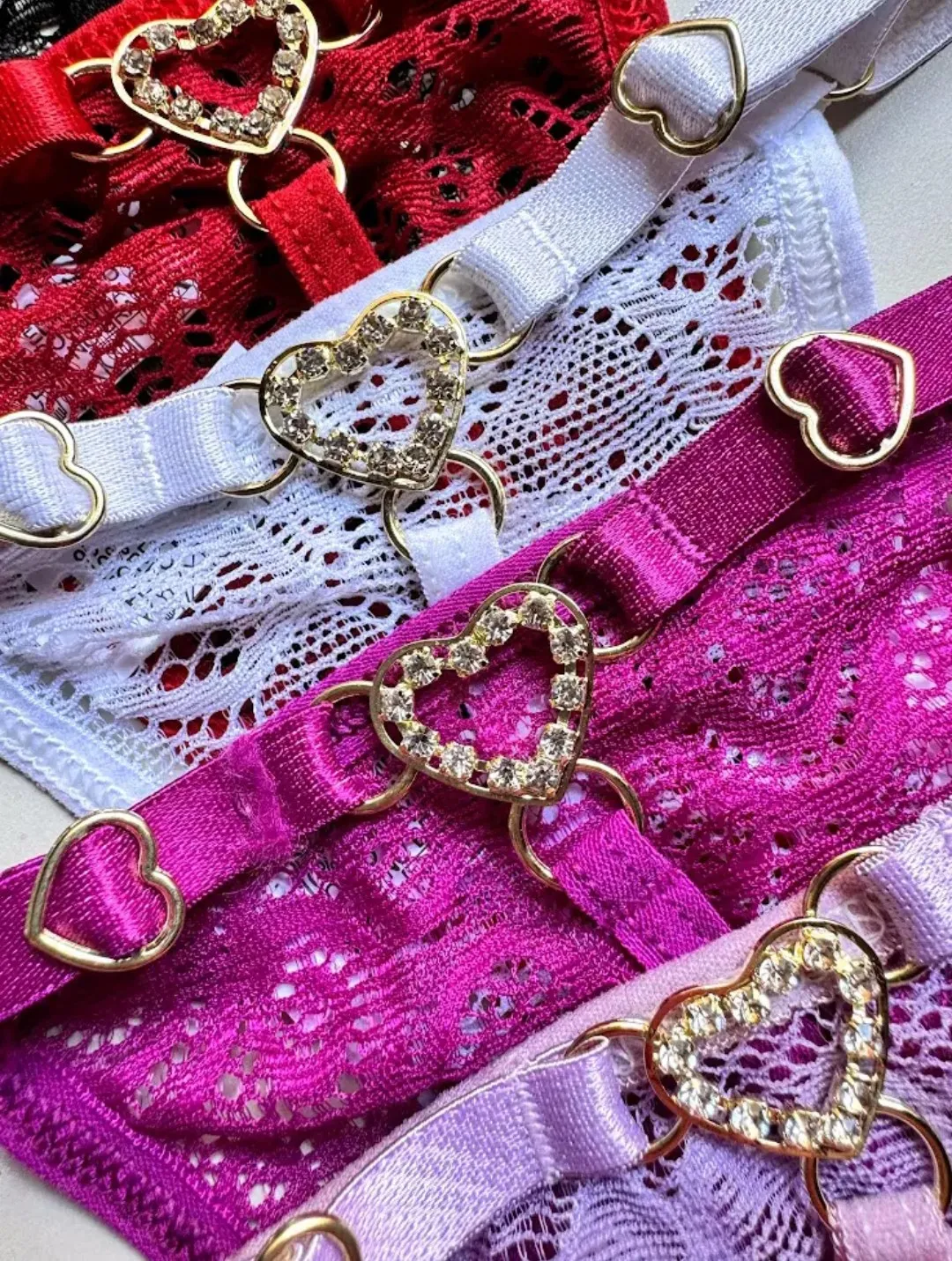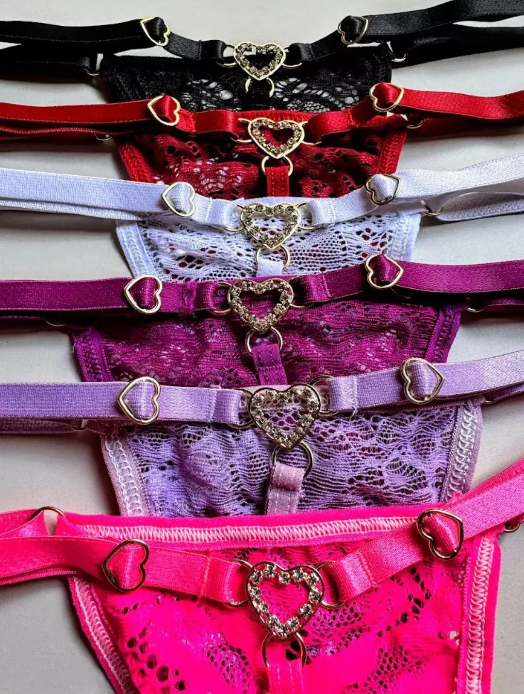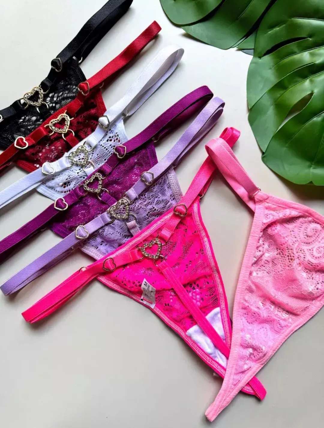 Tanga fio confeccionada em renda, alça de regulagem de coração em metal dourado, fundinho forrado em algodão e pingente dourado de coração cravejado em pedras atrás.