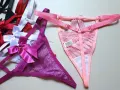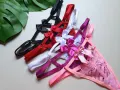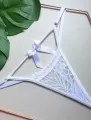 Tanga fio confeccionada em renda, semiaberta na frente com lacinho de cetim e alça de regulagem, fundo forrado em algodão.