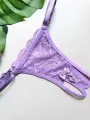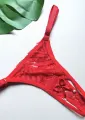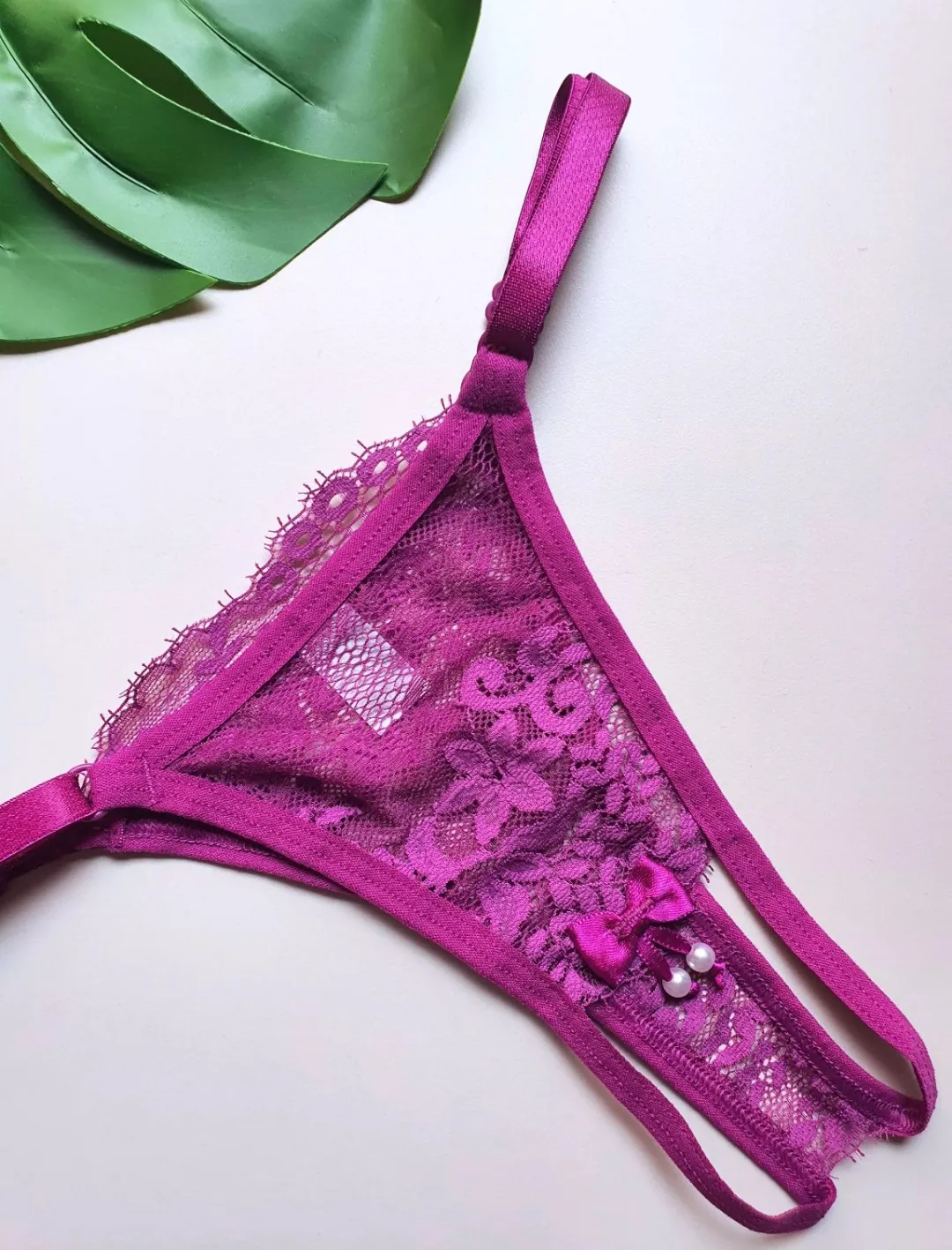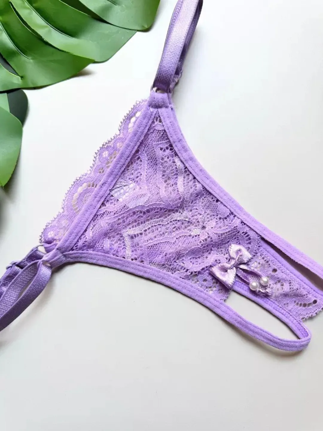 Tanga confeccionada em renda com abertura no fundo e lacinho com pérolas na ponta.