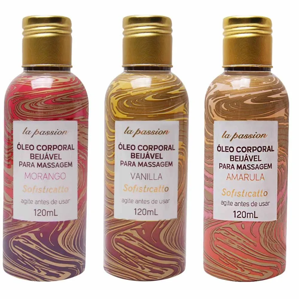 Óleo Beijável Massagem La Passion 120ml Sofisticatto. La Passion Óleo Corporal Beijável para Massagem da Sofisticatto é perfeito para quem deseja combinar o poder de sedução com uma massagem relaxante. Este óleo beijável oferece uma experiência sensorial completa, proporcionando uma sensação de hidratação, pele suave e perfumada. Escolha o aroma que mais combina com sua noite de prazer e divirta-se com os óleos corporais La Passion.
