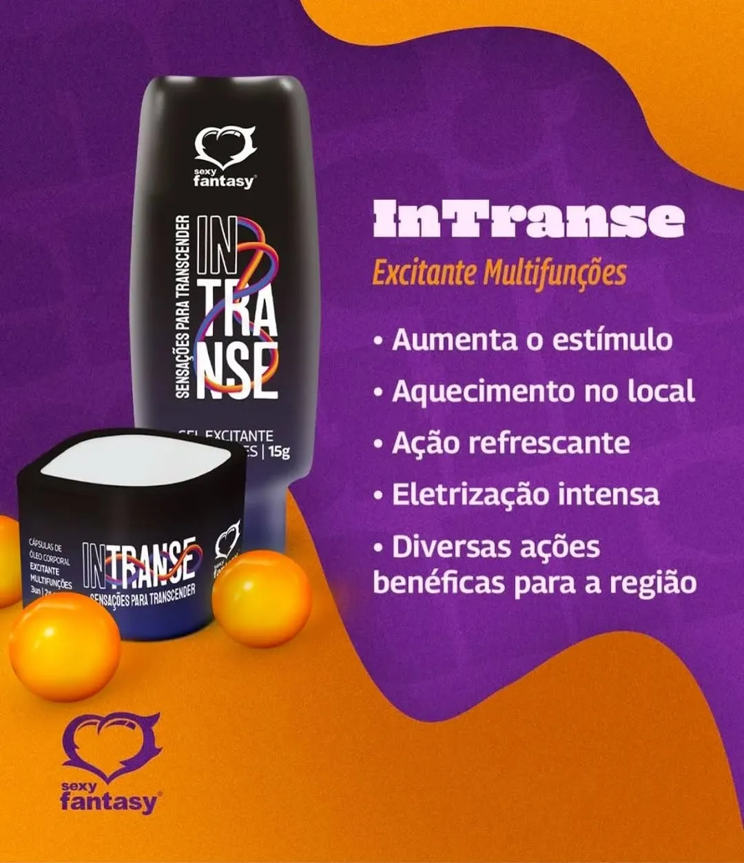 O INTRANSESexy Fantasy é um gel Unissex com multifunções, desenvolvido para aumentar o estímulo, aquecer a região aplicada, refrescar e eletrizar, além de possuir ação analgésica, anti-inflamatória, antioxidante, antimicrobiana, cicatrizante e hidratante. Todas essas ações num só produto, para transcender suas sensações. Quando essa maravilha está em contato com a pele excitada ele irá levar você a loucura e tranformar seu momento ainda mais prazeroso e cheio de sensualidade.