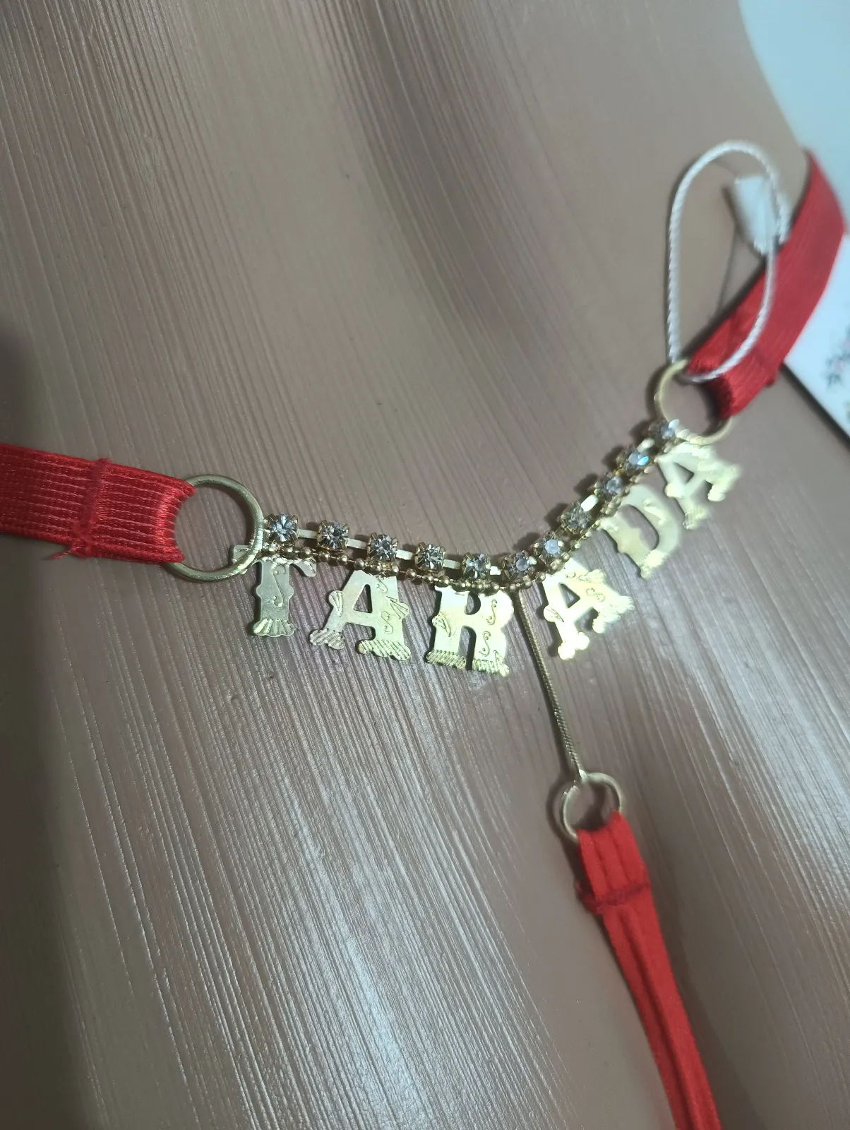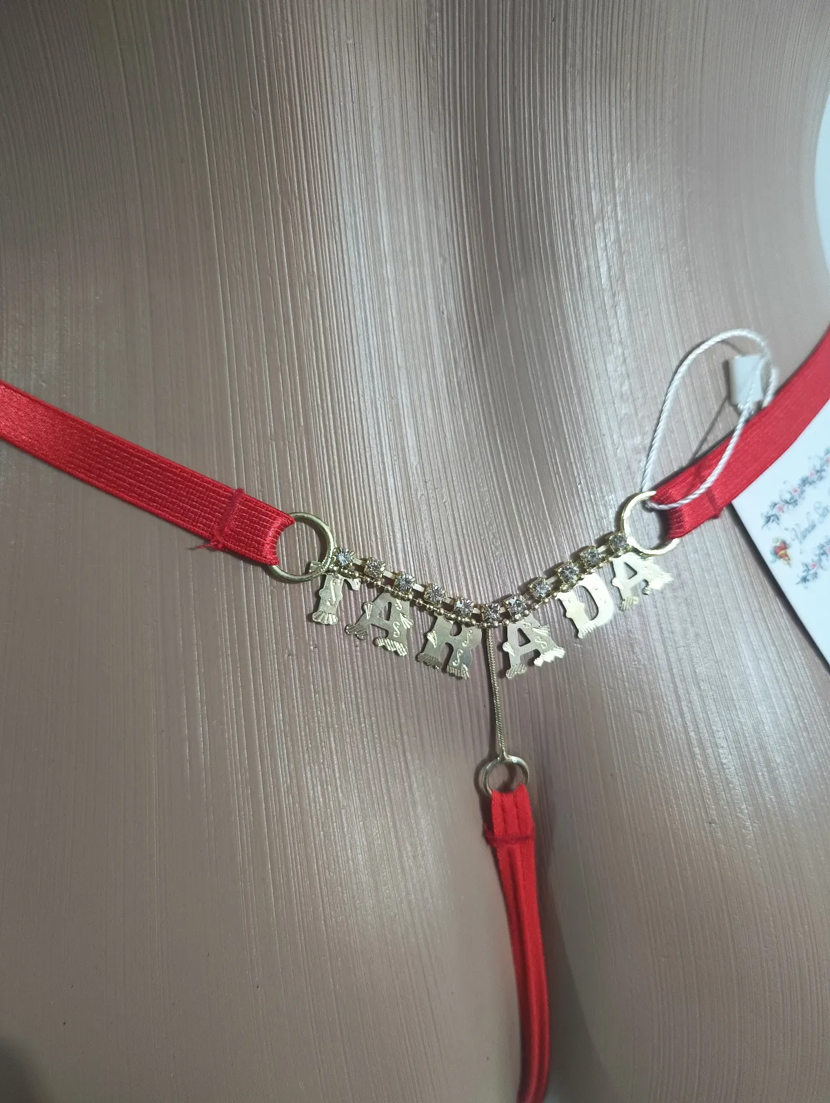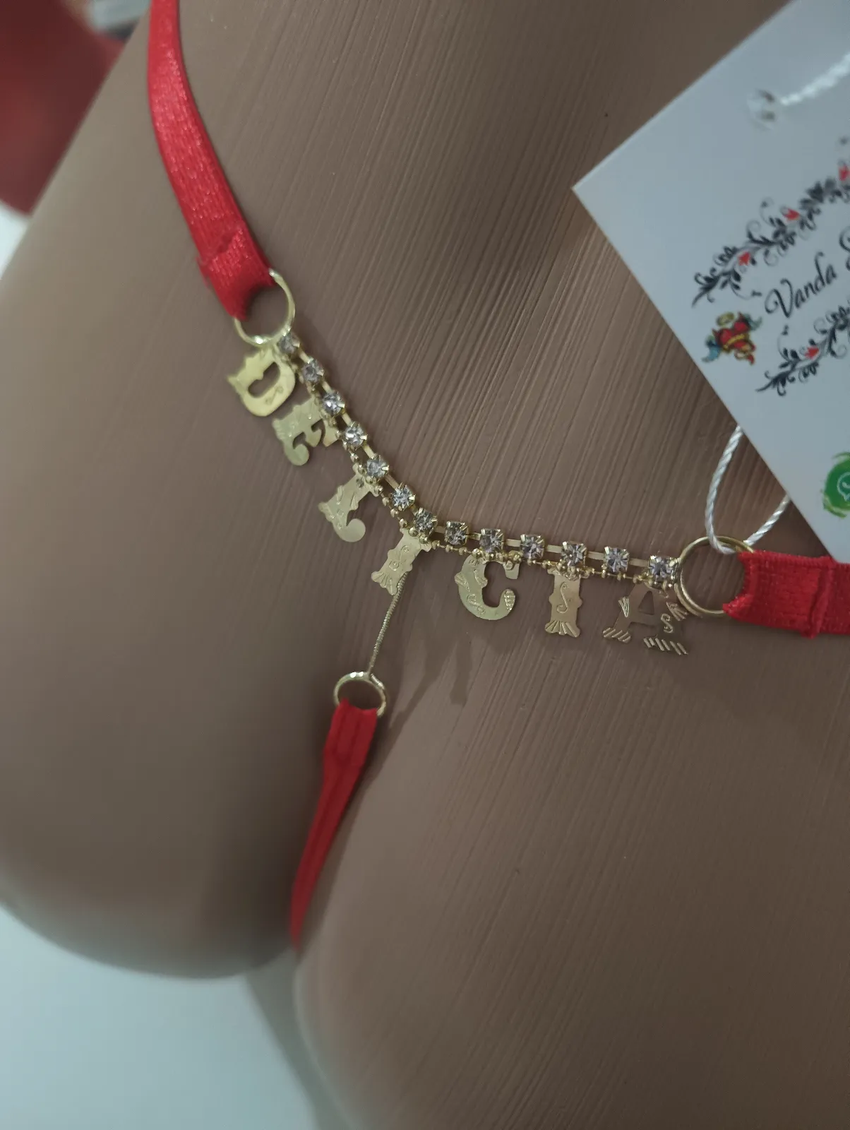 Possui palavra em dourado com pedrinha de strass na parte traseira.