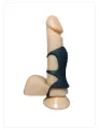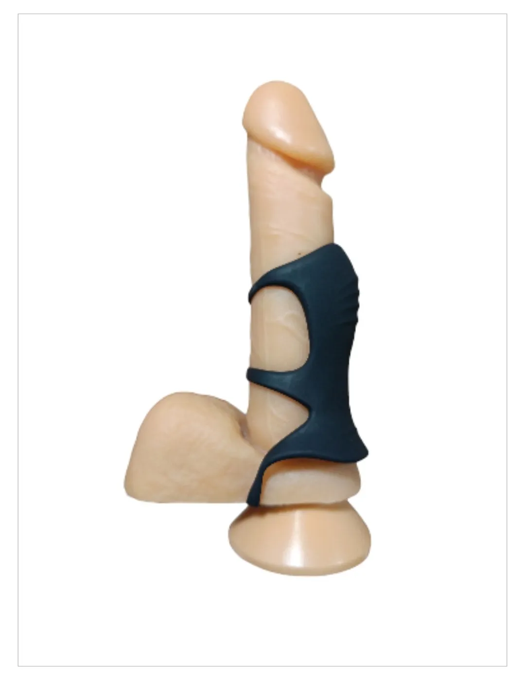 Anel peniano longo com três anéis, sendo um para uso no escroto.