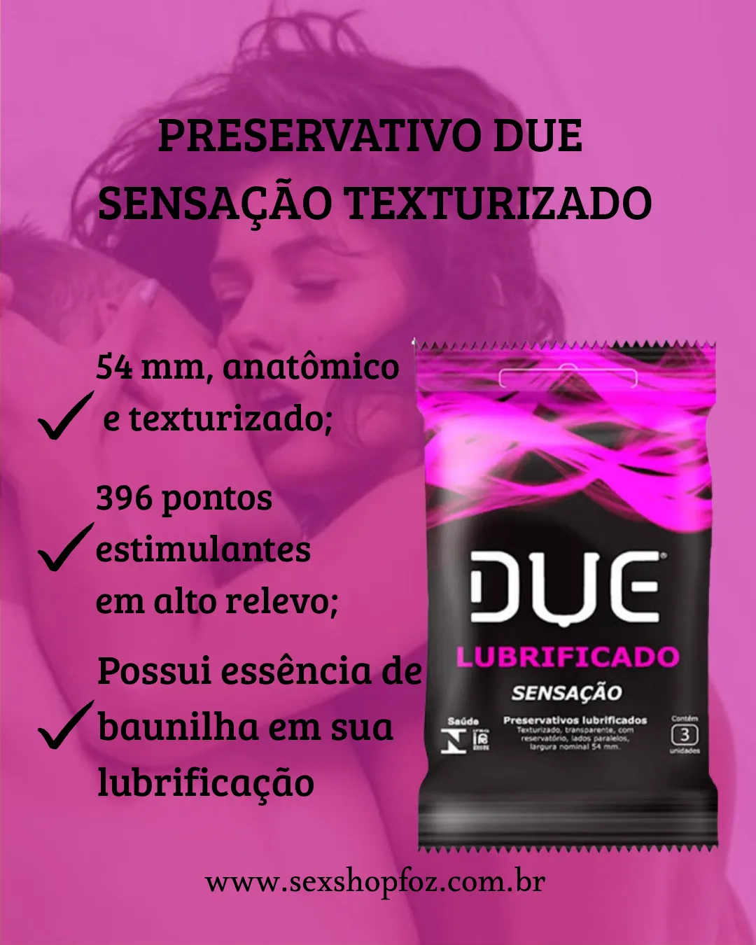 Preservativo Due Sensação 54mm Texturizado oferece proteção e prazer com 396 pontos estimulantes em relevo e lubrificação com essência de baunilha, garantindo conforto e sensações únicas.